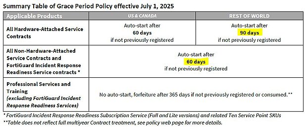 Fortinet a mis en place, à partir du 01.07.25, de nouvelles dispositions concernant l’activation automatique des bundles hardware et des licences (support inclus). La période de grâce a été adaptée comme suit.